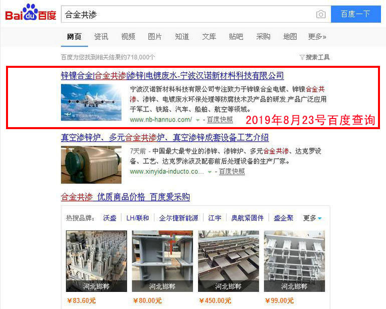 合金共滲 百度(PC)自然排名第1名,360搜索、搜狗、手機搜索等均也有比較好的排名...
